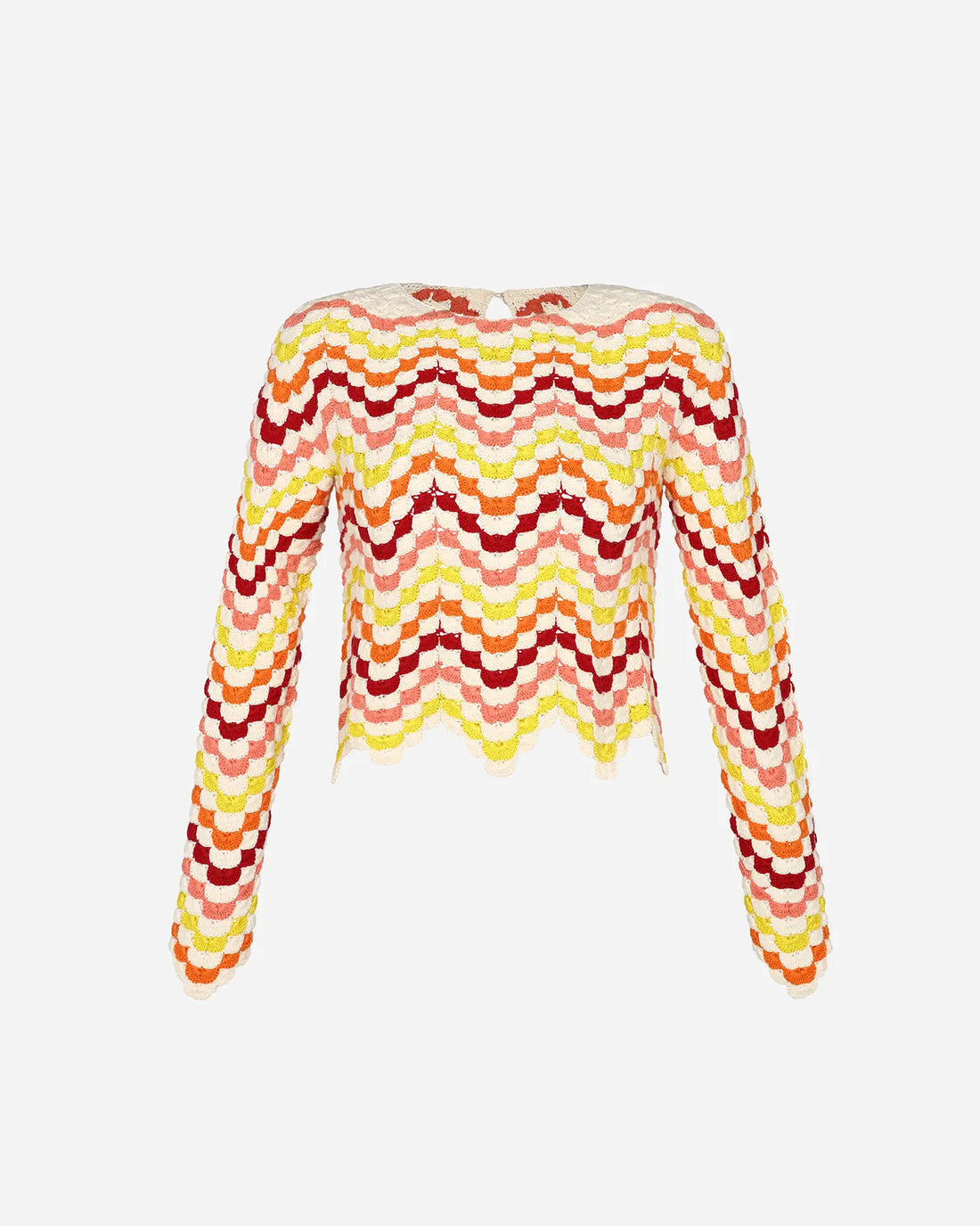 Composition: 100% Cotton Color: Multi Description The SAFI Top is a crew-neck, long-sleeve piece hand-crocheted...