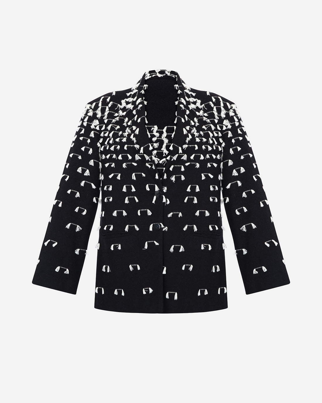 Composition: 100% Cotton Color: Black | Ivory Description A straight cut blazer with fringes and...
