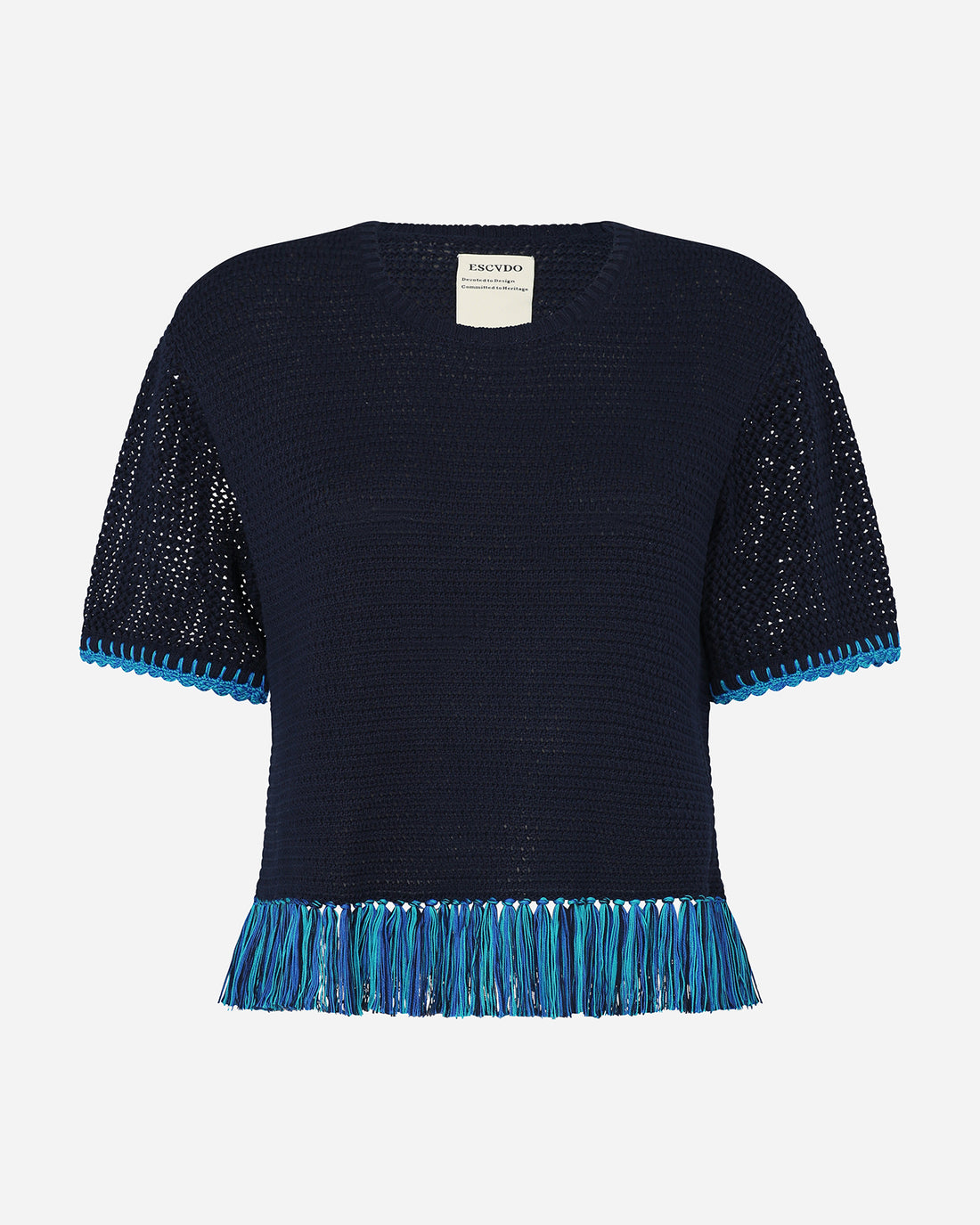 Composition: 100% Cotton Color: Navy Description A square-shaped crop top adorned with hand-applied fringes at...