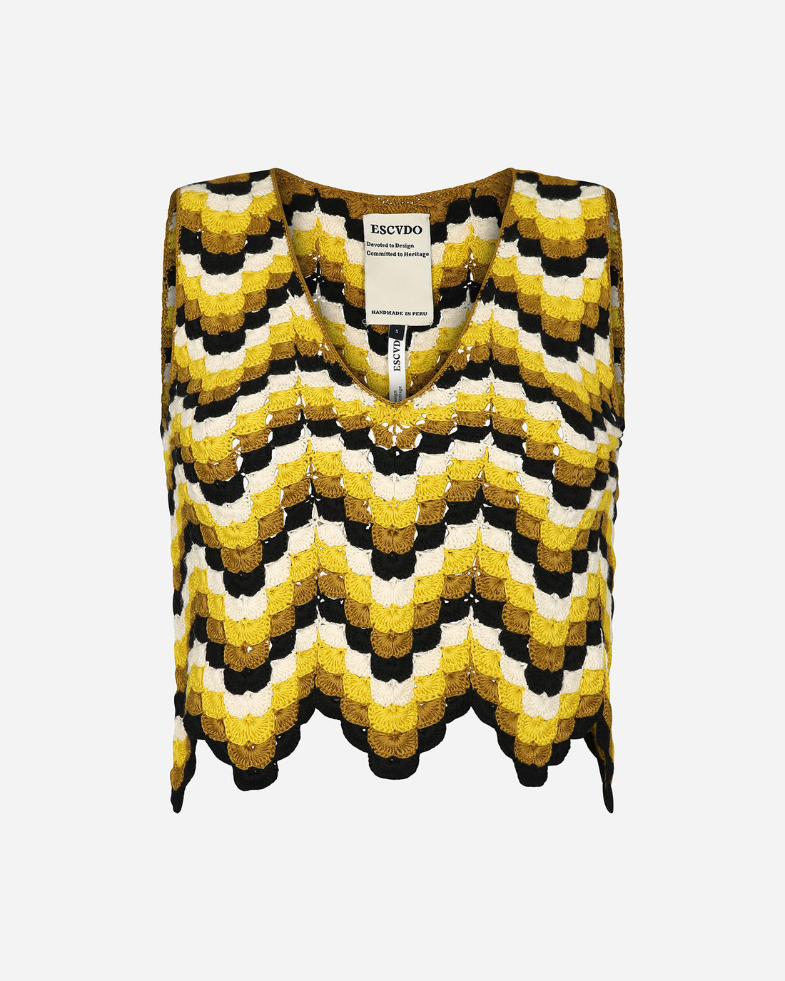 Composition: 100% Cotton Color: Golden / Black Description: A V-neck, sleeveless top crafted using our traditional Abanico...