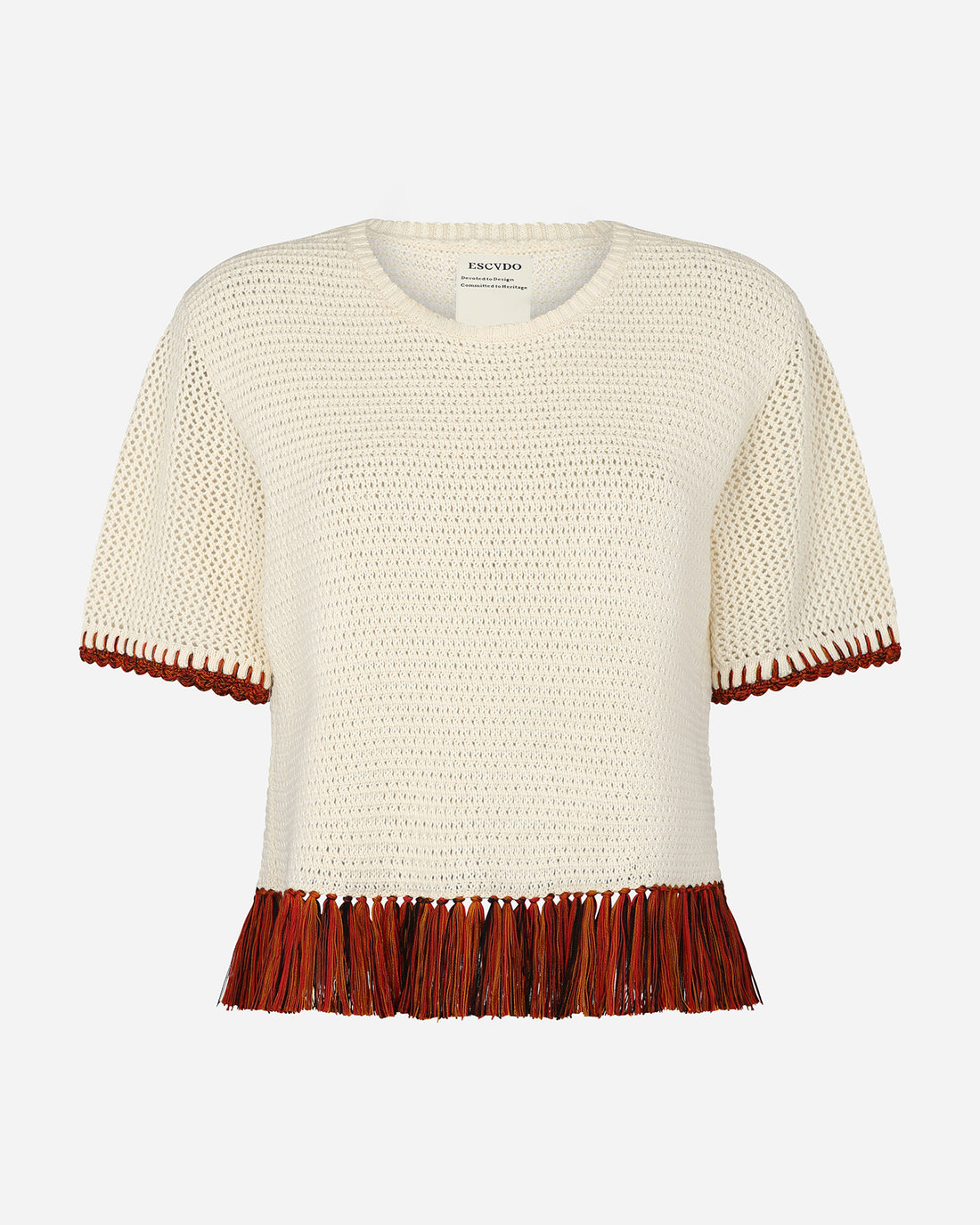 Composition: 100% Cotton Color: Ivory Description A square-shaped crop top adorned with hand-applied fringes at...