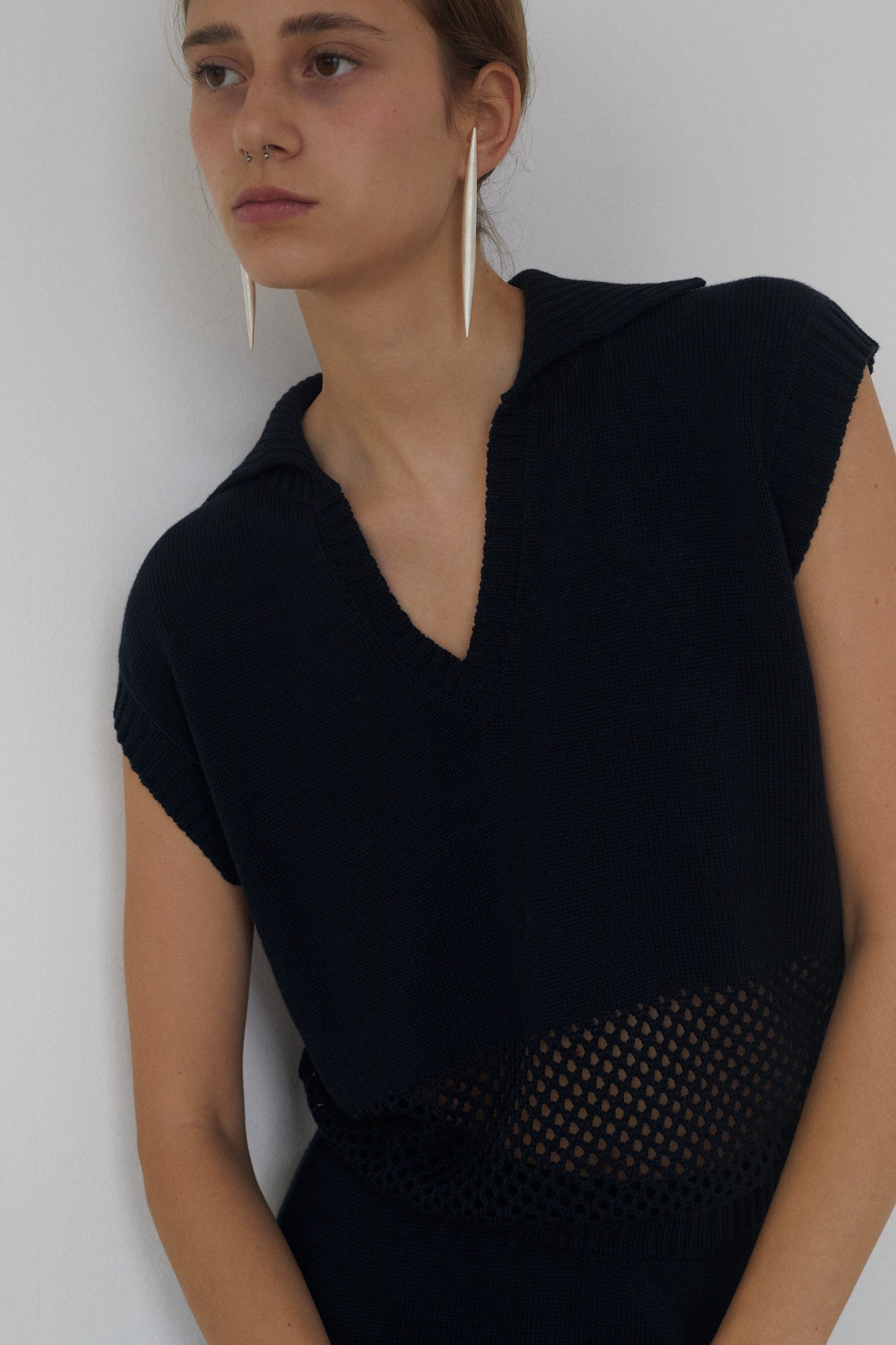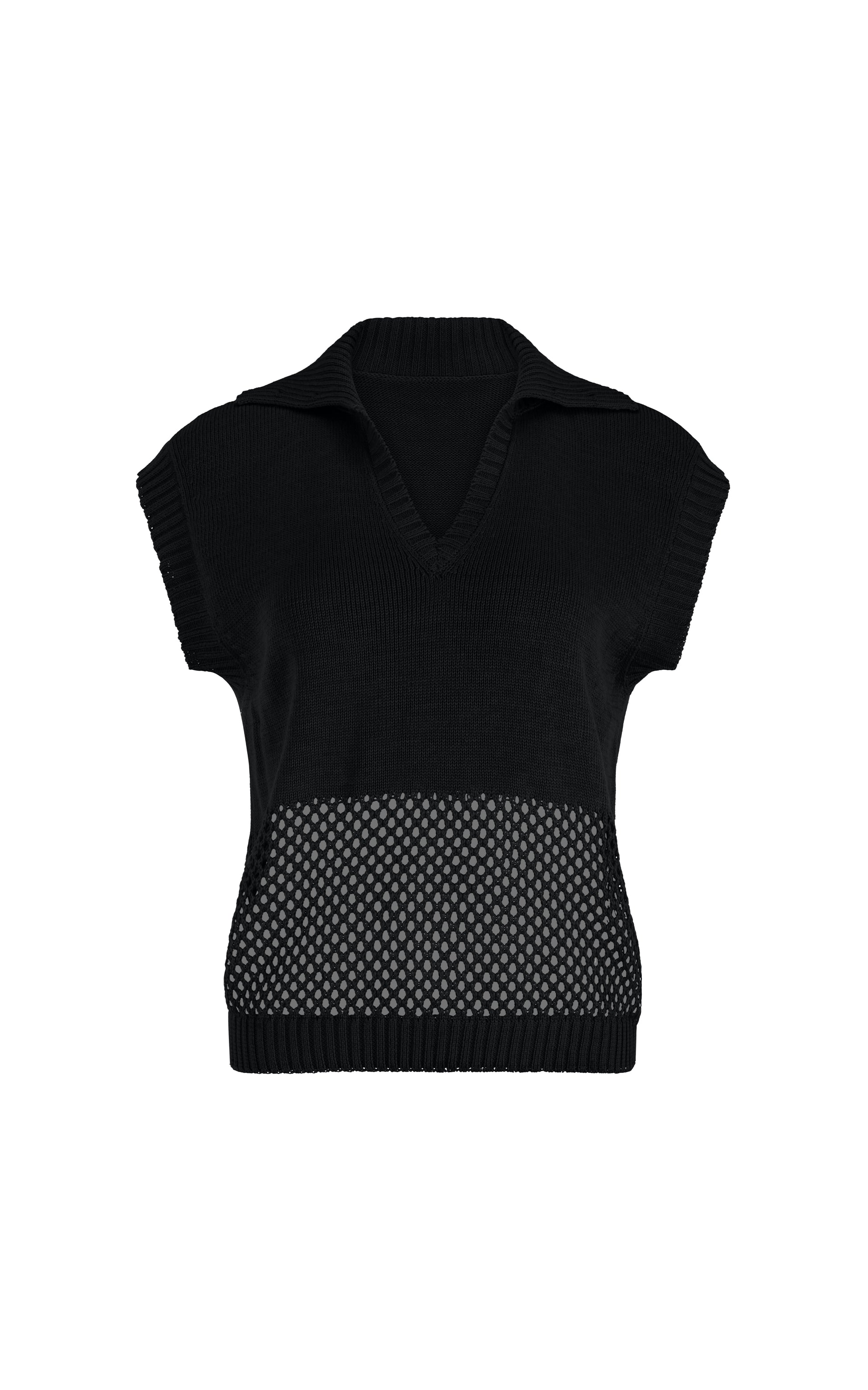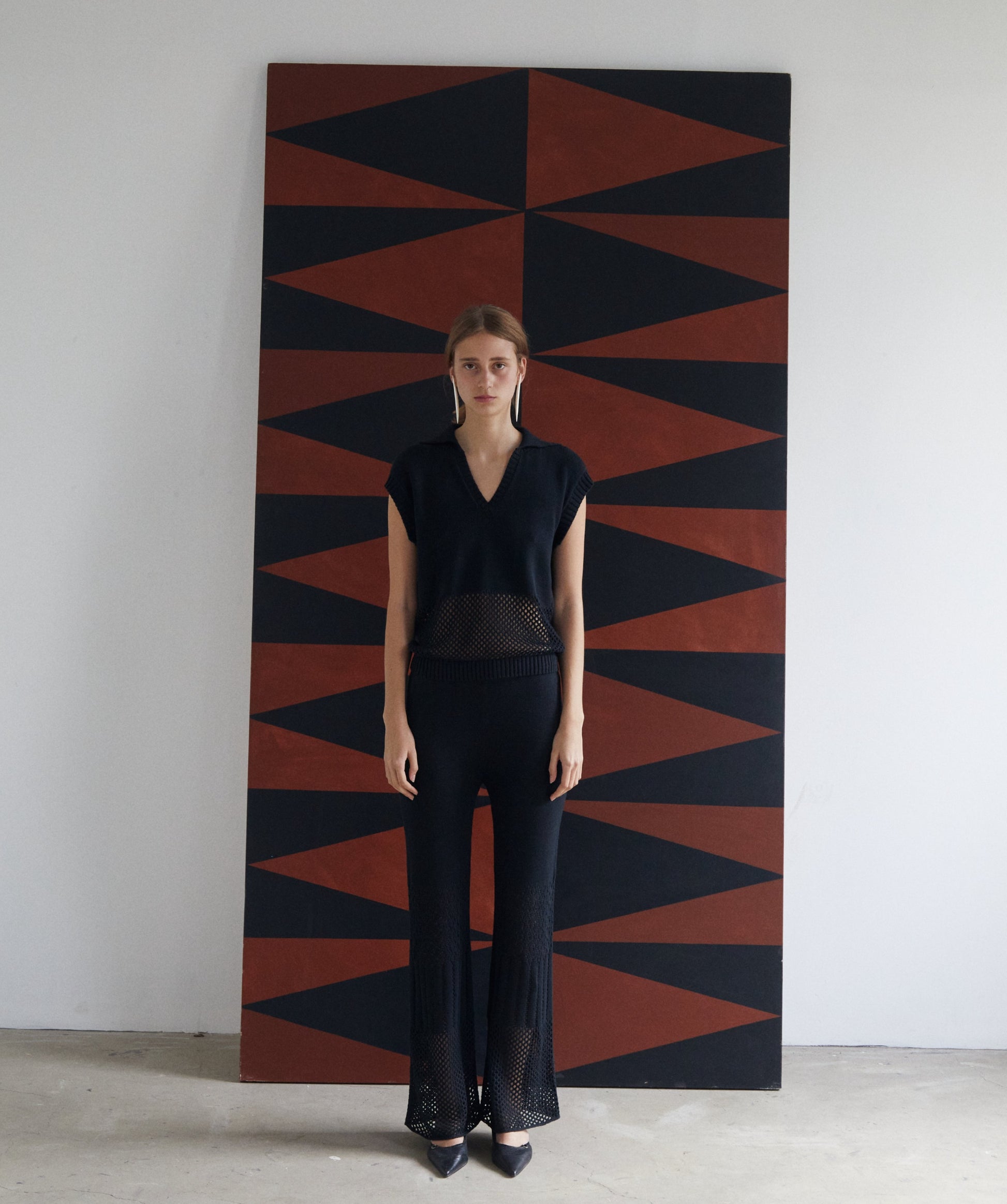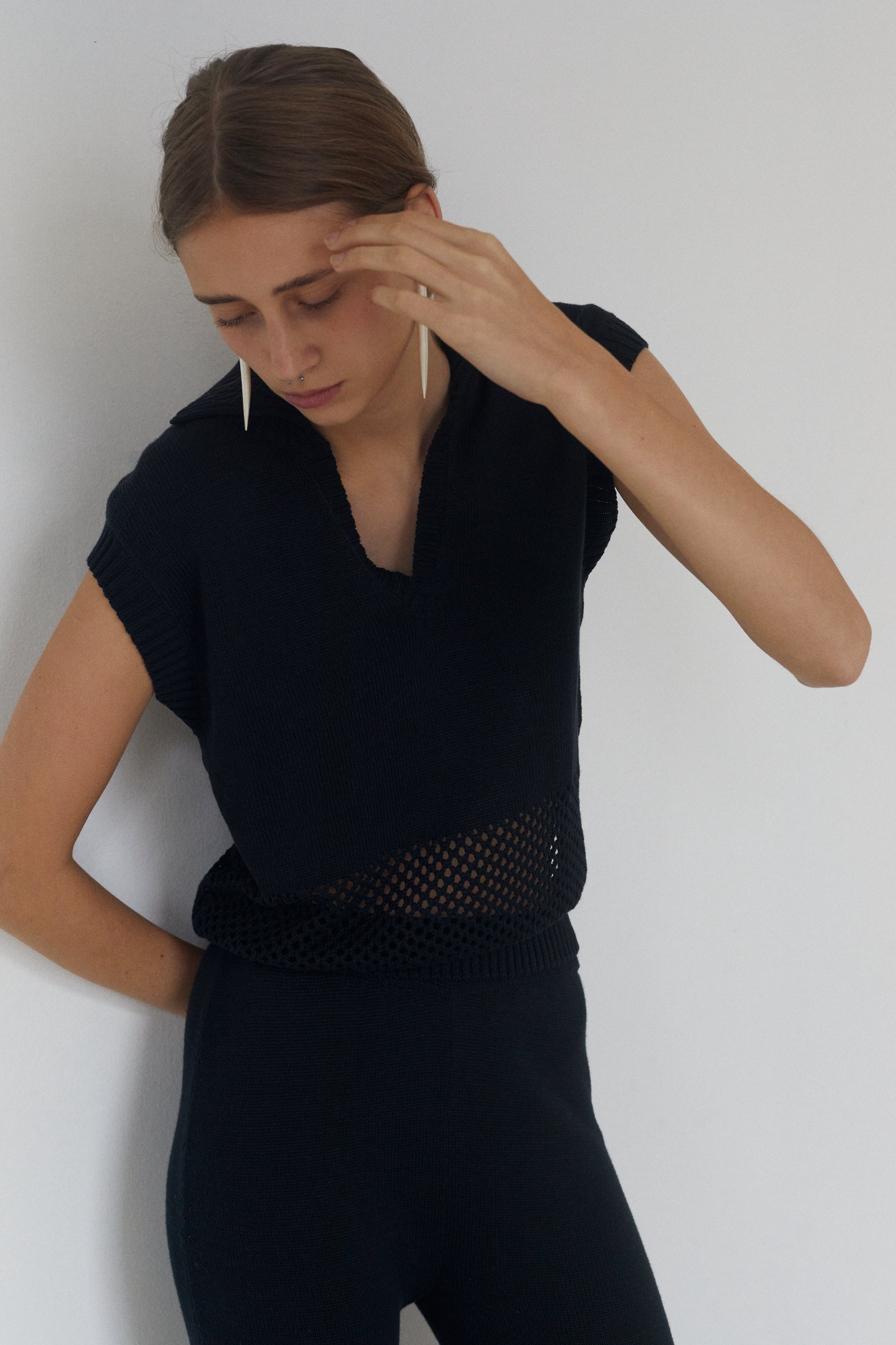 The polo style shirt is reimagined and made artisanally by machine. The LIA combines a simple stitch with openwork stitch to create a more fitting silhoutte forming tee. The neck and the hems of the cuffed sleeves are made in rib knit to achieve a different density that keeps everything in place. In Premium cotton, this is a summer essential all the way.