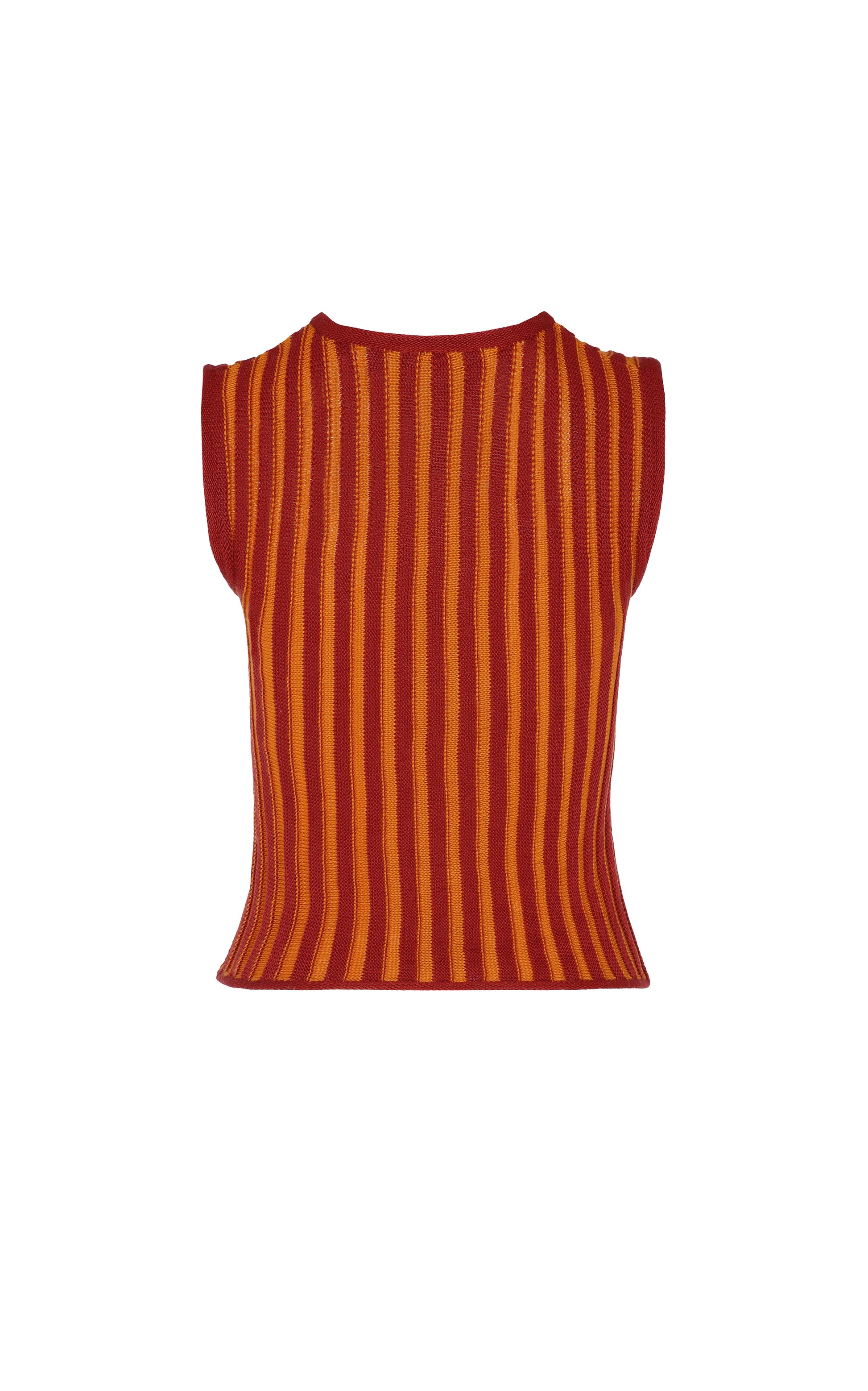 A contemporary halter top with a crew neck, it has been knitted mixing orange and burgundy threads, to create a unique color part of the ALAMAR Collection palette. A soft and breezy top for the summer, in Peruvian cotton.