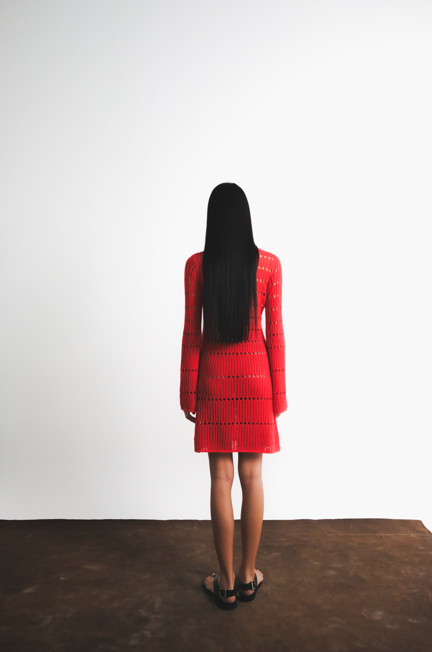 The MISHI Mini Dress features a chic 60s-inspired silhouette, bell sleeves, and a V-neckline. Crafted from 100% cotton and machine-knitted for comfort and structure.