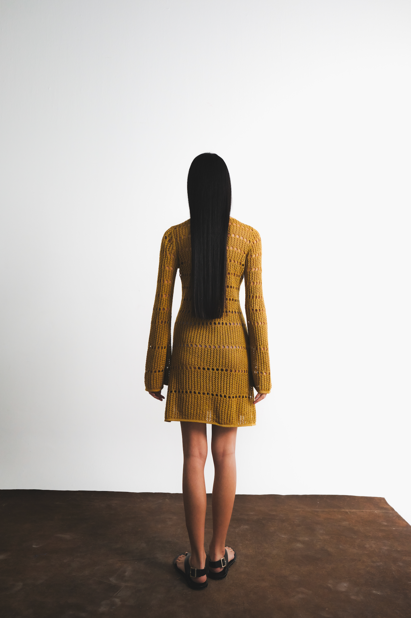 The MISHI Mini Dress features a chic 60s-inspired silhouette, bell sleeves, and a V-neckline. Crafted from 100% cotton and machine-knitted for comfort and structure.