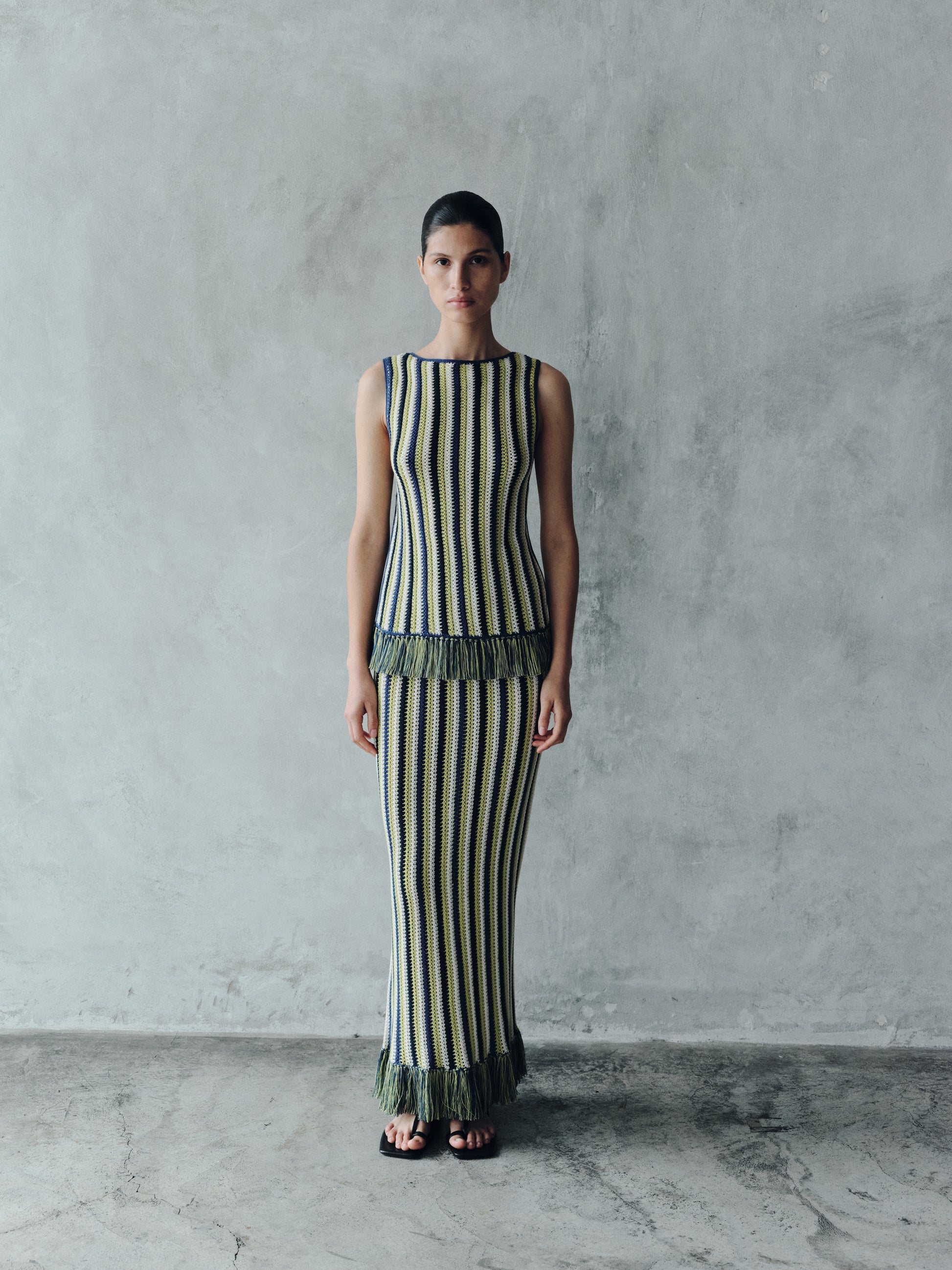 The MISTI Skirt is a sophisticated midi-length piece that seamlessly combines structure and artistry. This tubular skirt is machine-knitted from 100% cotton, offering a sleek and comfortable fit. Hand-applied fringes at the hem add a dynamic touch, celebrating the craftsmanship and attention to detail that define its design.