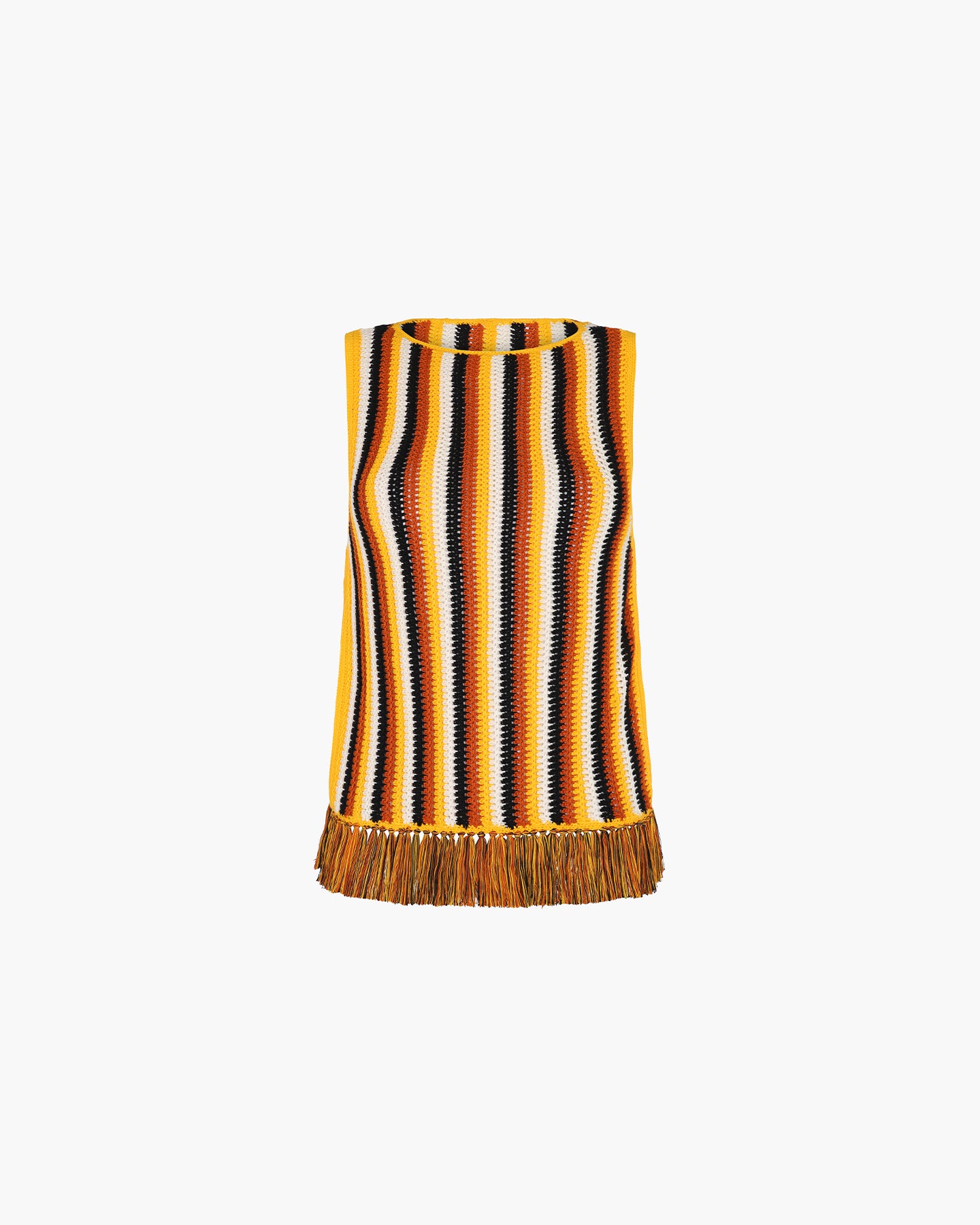 The MISTI Top is a refined sleeveless piece crafted from 100% cotton, blending simplicity and intricate detailing. This fitted top is machine-knitted for a smooth, tailored finish, while side openings add a touch of modernity and ease. Hand-crocheted trims on the neckline elevate the design, showcasing the artistry and craftsmanship behind its creation. A versatile essential that transitions effortlessly through styles.