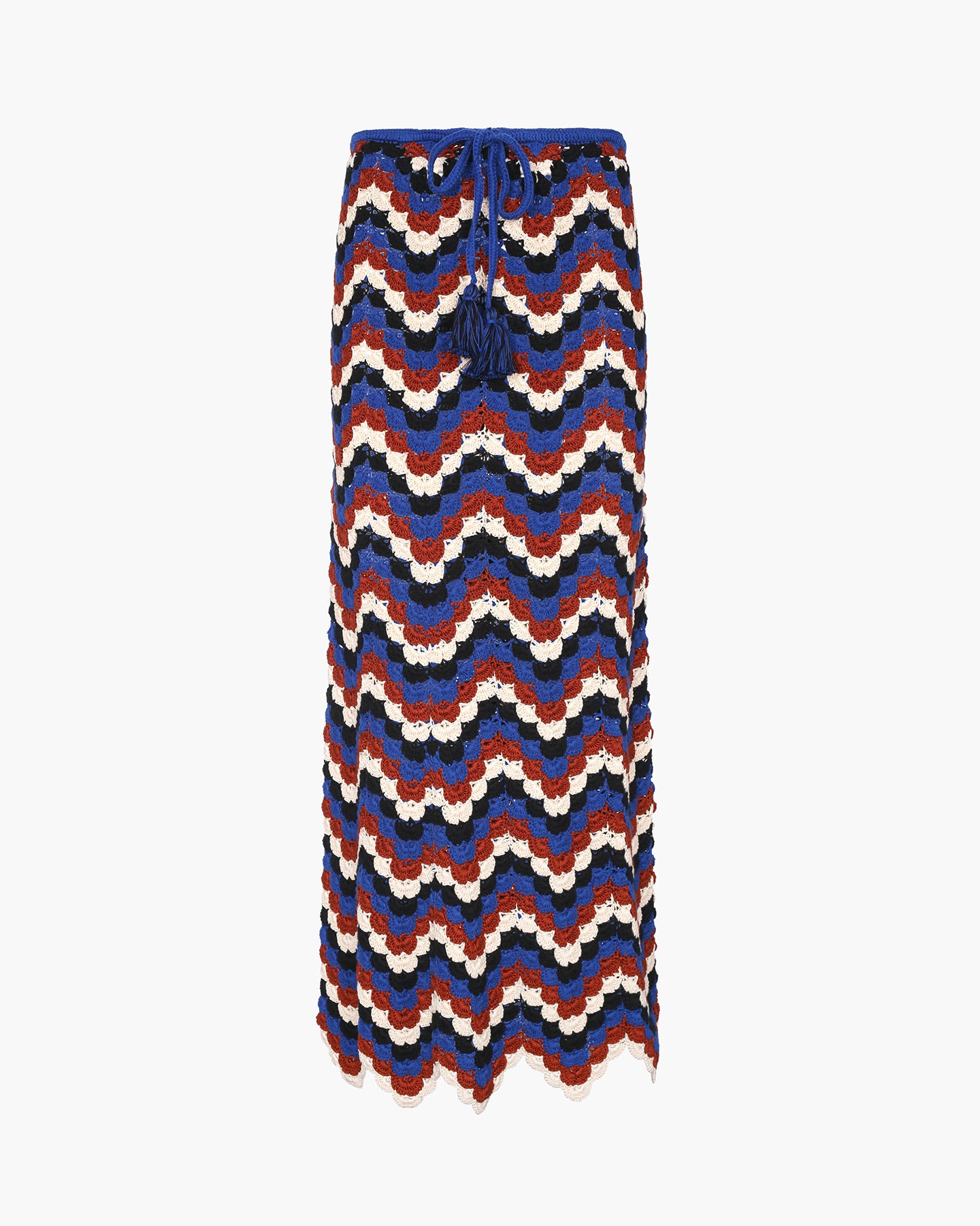 An ESCVDO staple piece expressing a passion for handmade patterns. The SAFI Skirt is a collaboration with expert knitters. Each piece is made by only one person, so the hand and crocheting style is absolutely even. The palette is the basis for the CORDILLERA collection, a mixture of cool tones with a pop of red.
