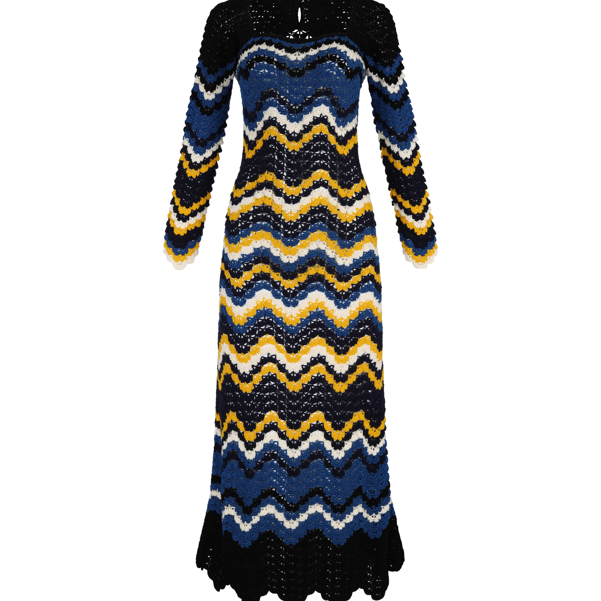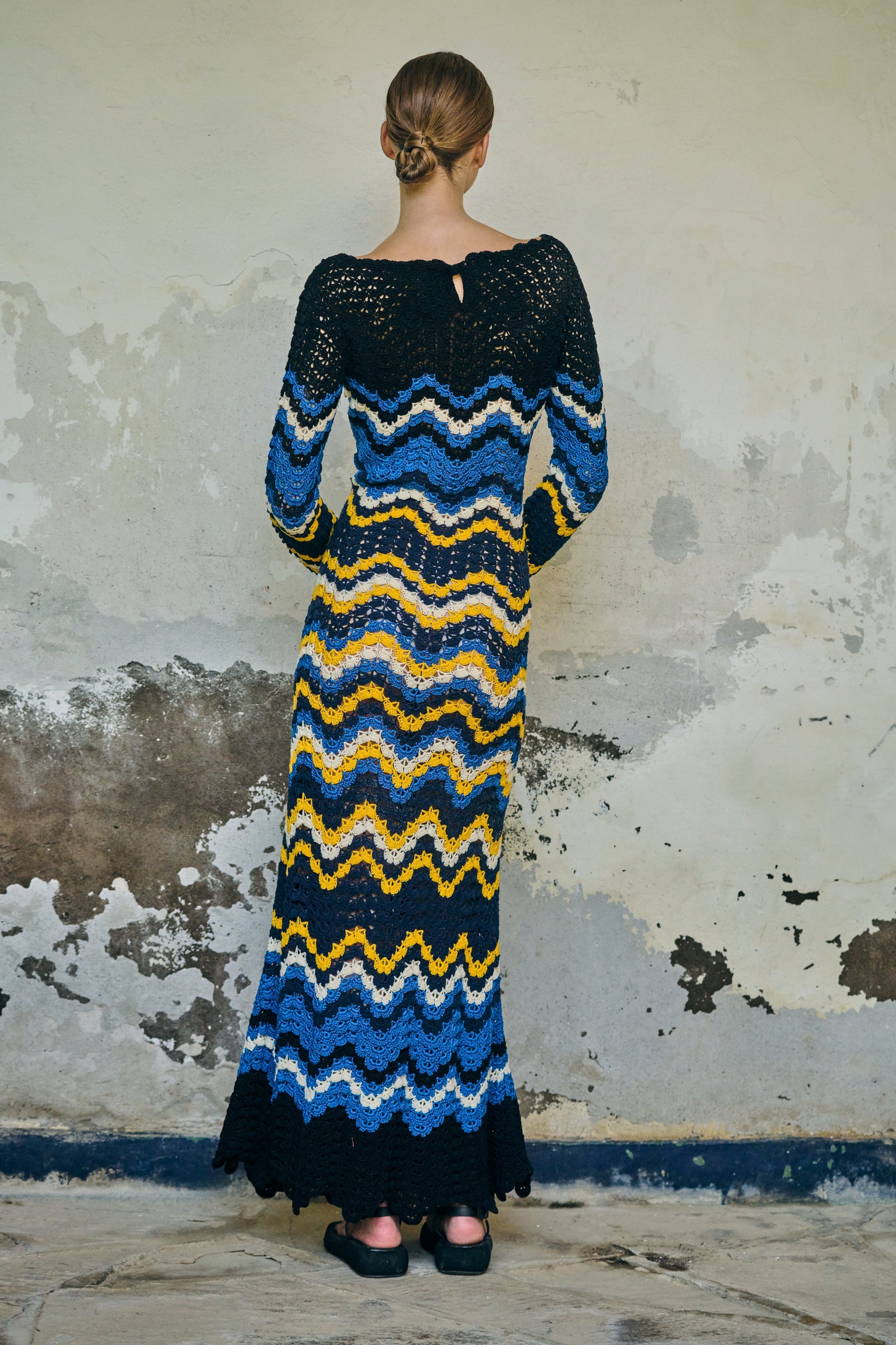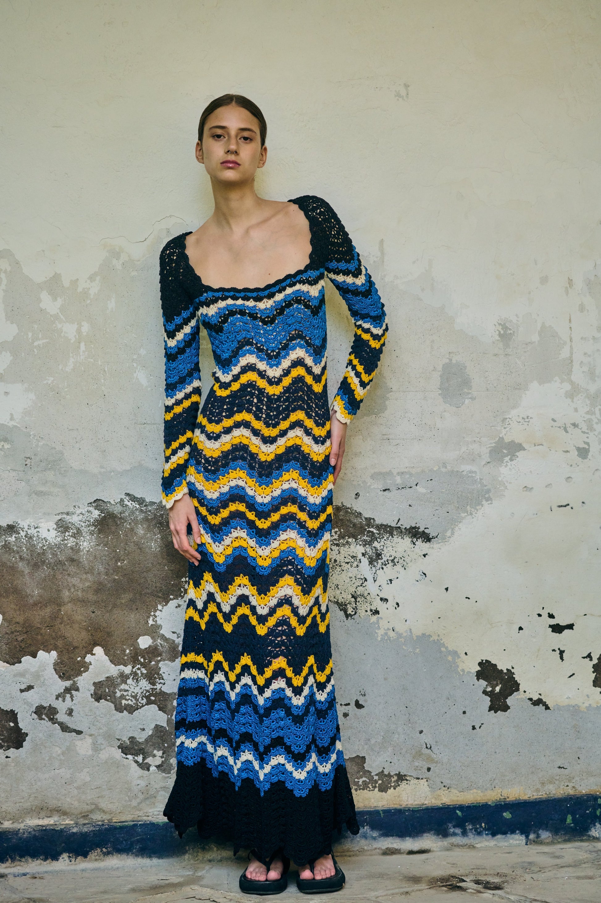 The SUMAC plays with the special blue, navy and ivory designed at the ESCVDO Studio for the CAMINO collection, as a homage to the Peruvian coast line. A classic silhouette of the brand, each dress takes our knitters over two weeks of full crochet inmersion, and it is made by only one person, so the hand and crocheting style is absolutely even. Made in premium Peruvian cotton.