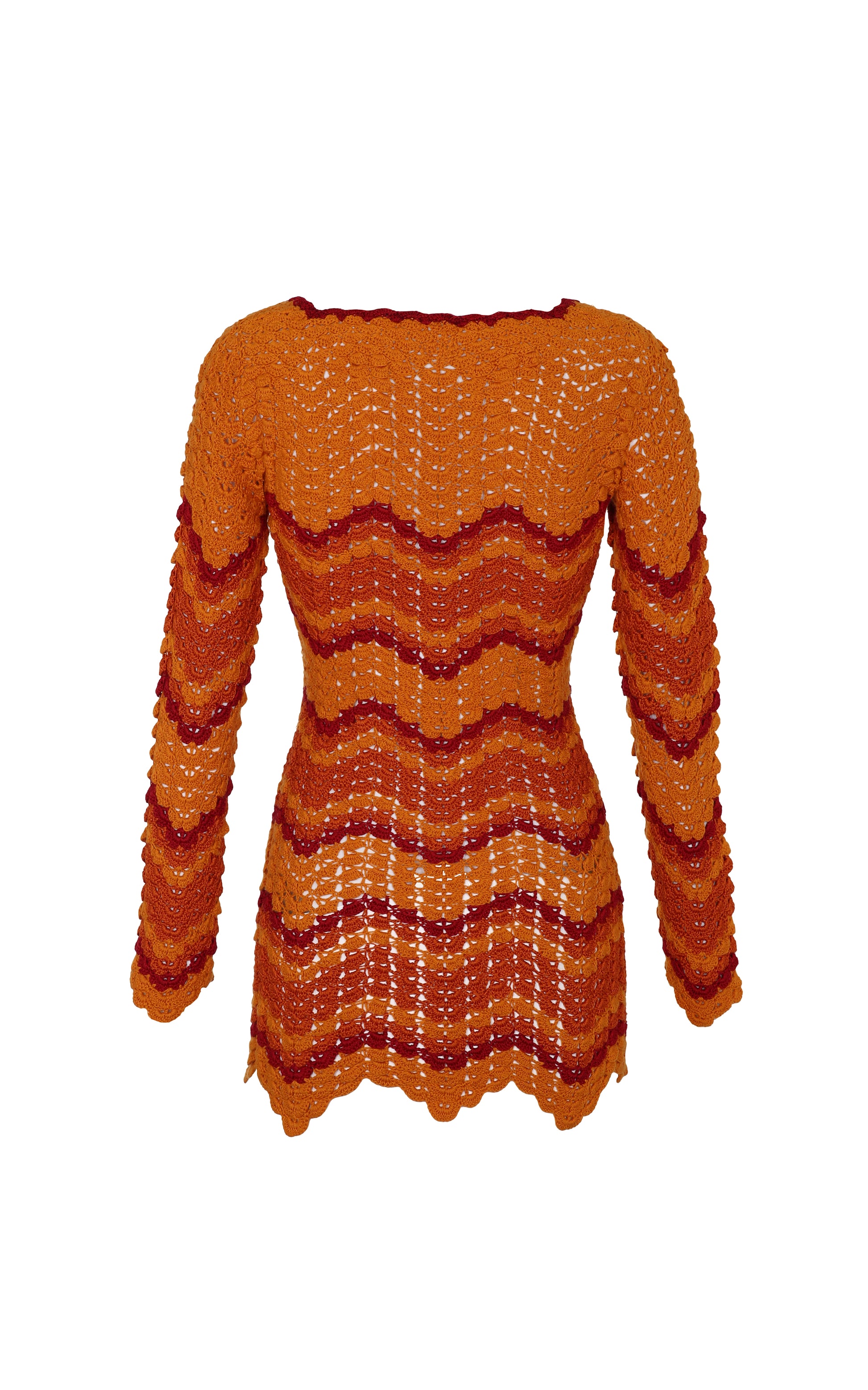The SUMAC plays with the color palette that defines ALAMAR as a collection inspired by the Peruvian coast, all designed at the ESCVDO Studio. A new take on a classic silhouette of the brand, this mini dress takes our knitters two weeks of full crochet immersion, and it is made by only one person, so the hand and crocheting style is absolutely even.