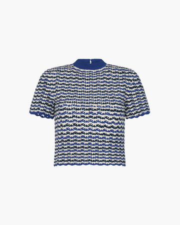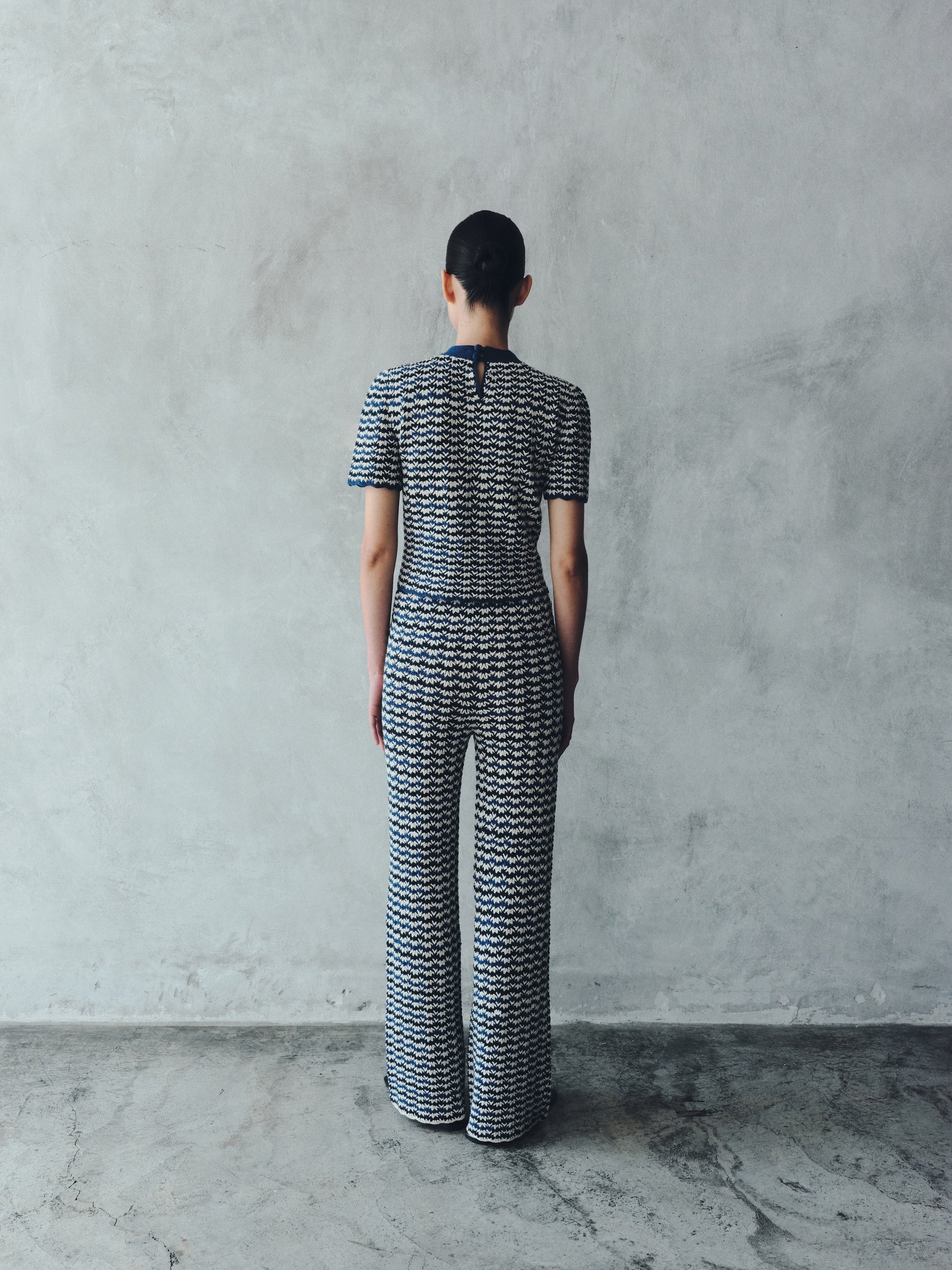 The WAYRA Crochet Shirt is an exquisite hand-crocheted top crafted from 100% cotton. This short-sleeved design features a sophisticated high neckline and showcases the intricate Colmillo stitch, a unique pattern reminiscent of classic pied de poule. Effortlessly blending timeless elegance with artisanal craftsmanship.